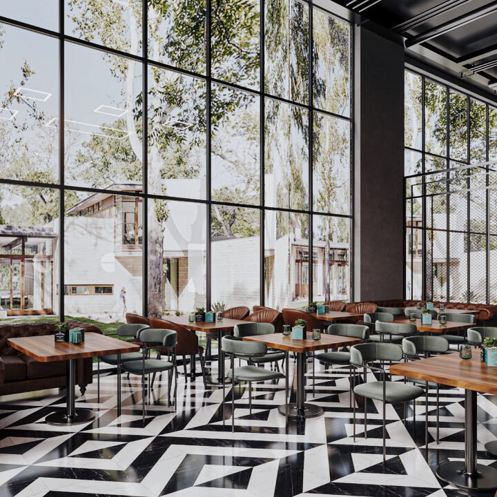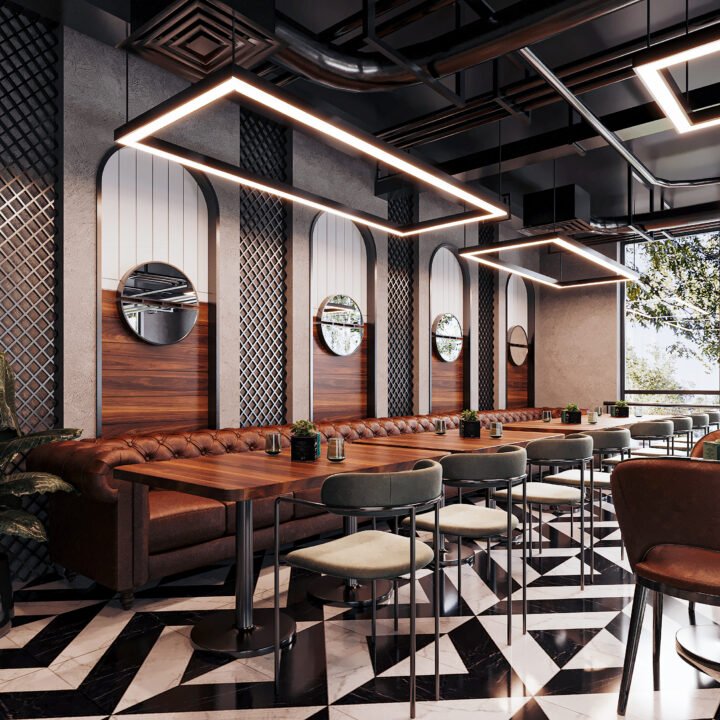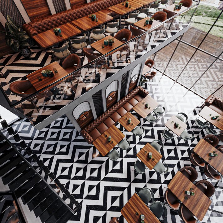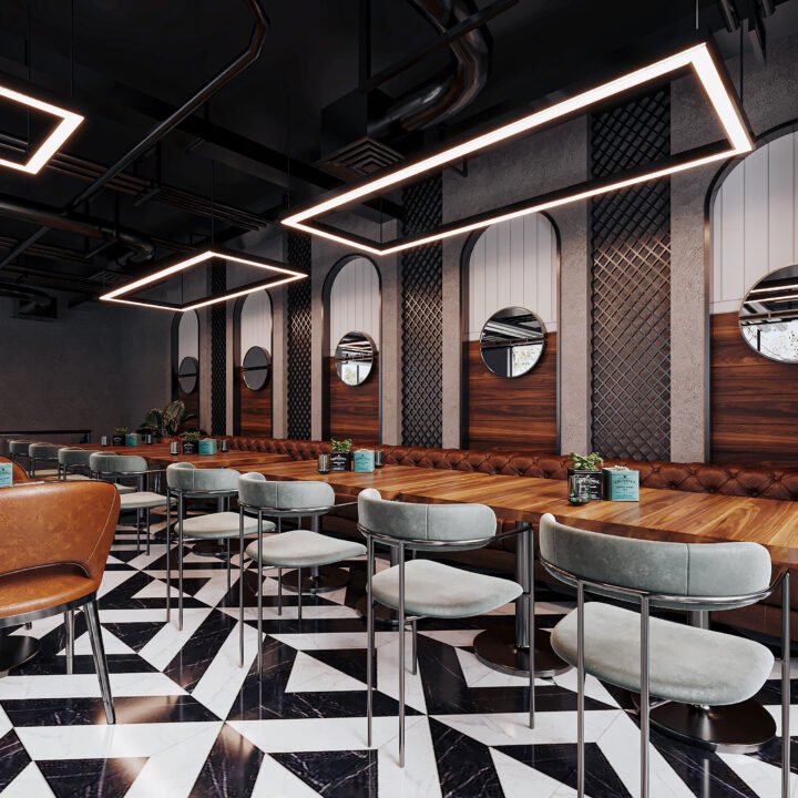 This modern luxury restaurant design by Izza Interior Design Studio is a masterful interplay of geometry, natural light, and tactile richness. The double-height layout immediately establishes grandeur, while bold black-and-white patterned flooring introduces rhythm and visual energy into the space. Above, custom-designed LED ceiling grids extend this geometric language vertically, adding both illumination and sculptural impact.