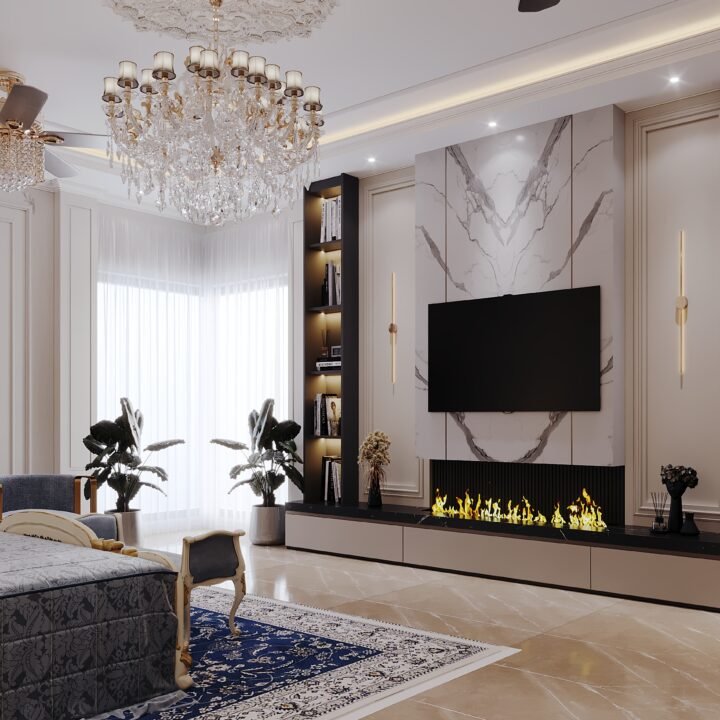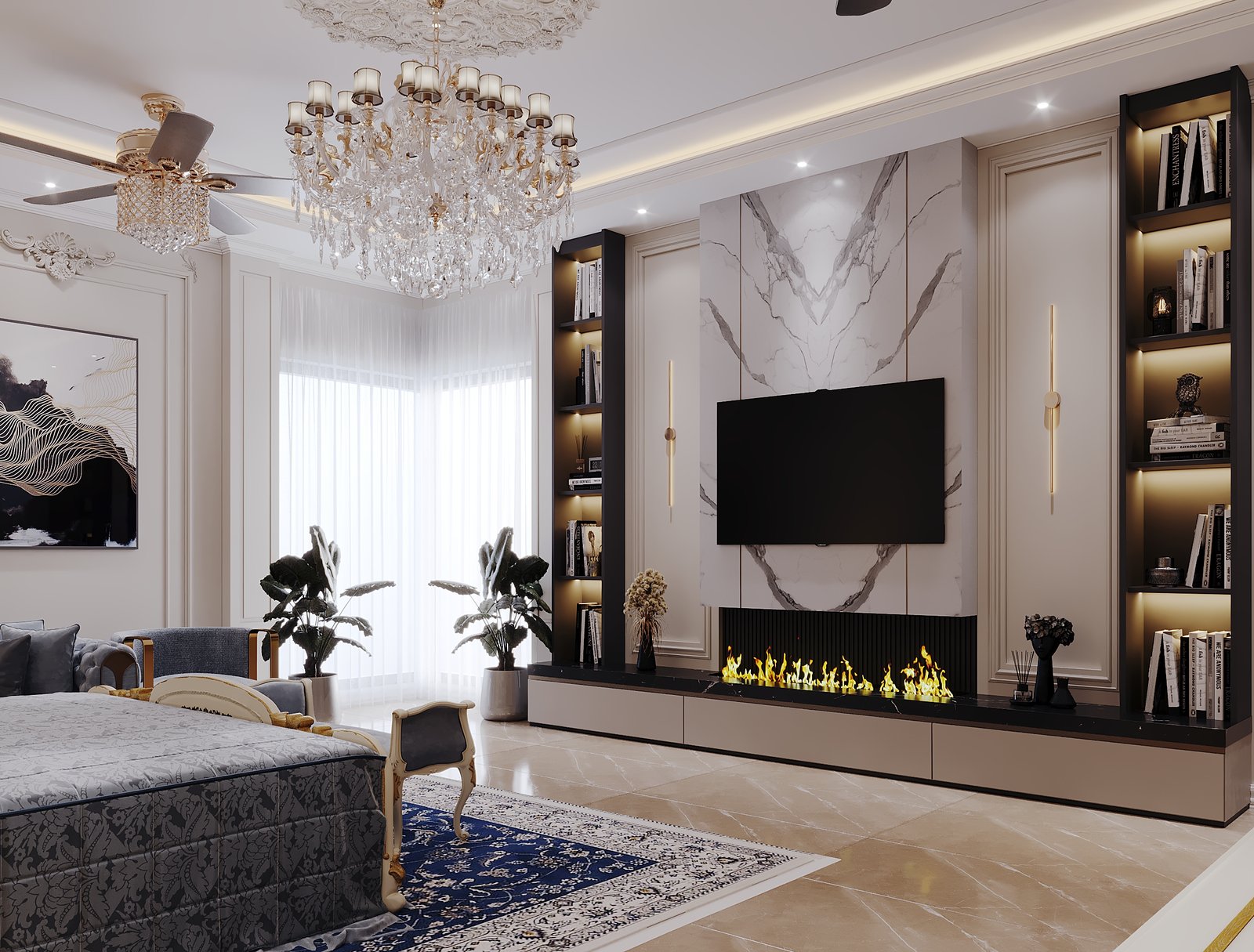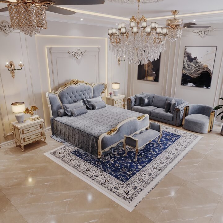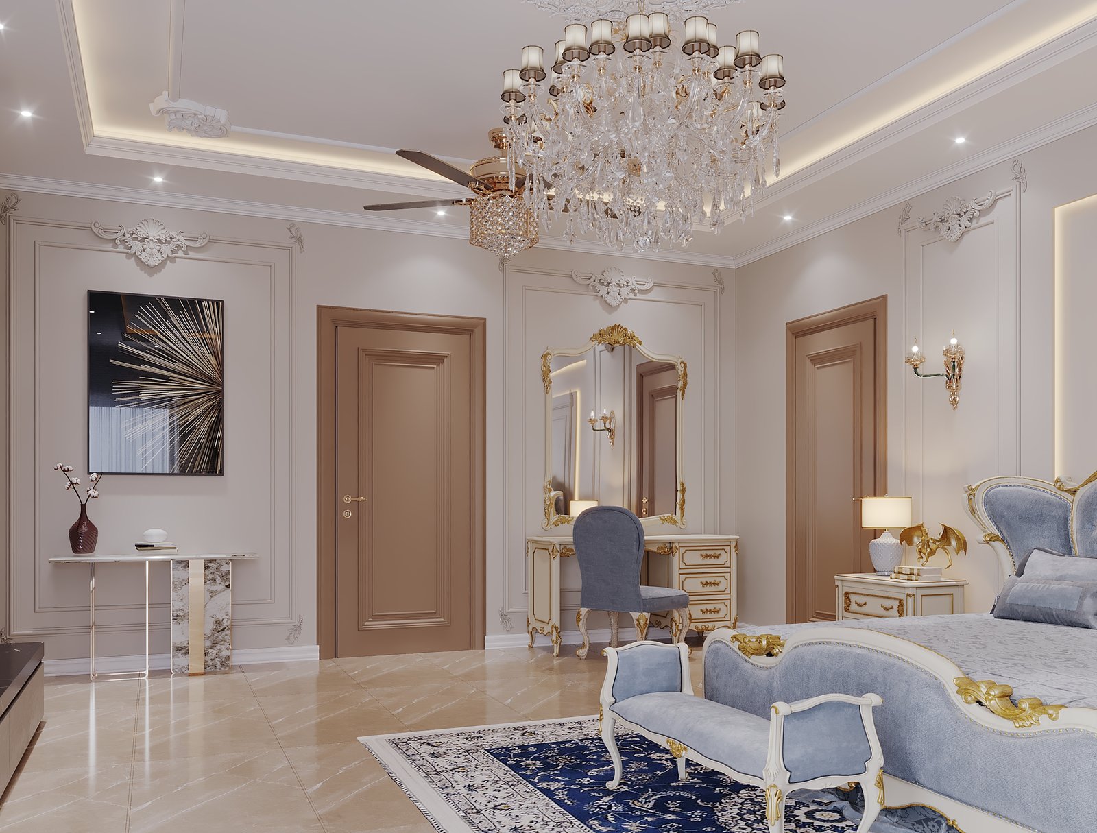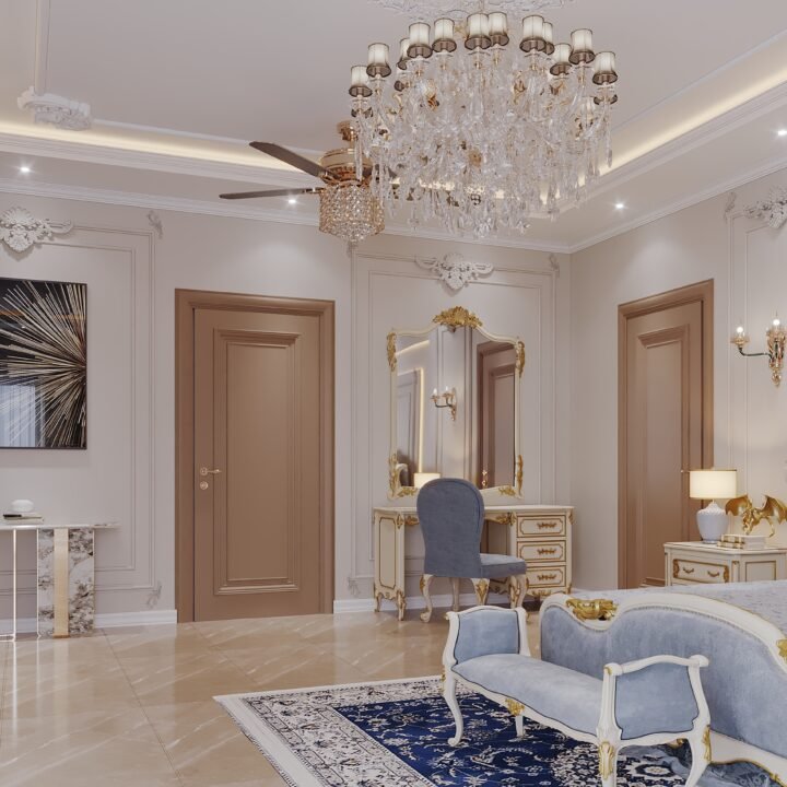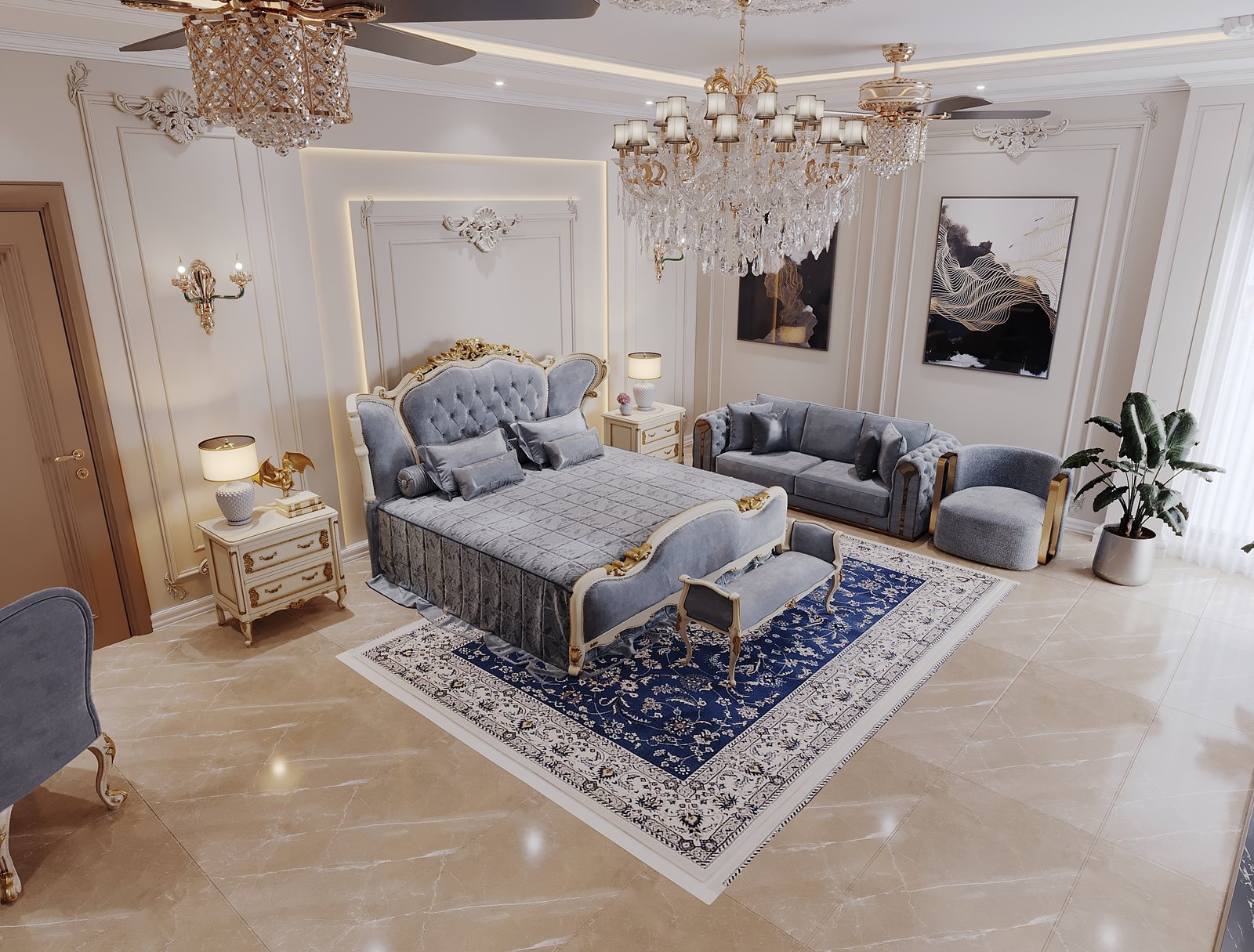 At Izza Interior Design Studio, we believe in blending history with modern living—creating interiors that feel timeless yet tailored to today’s lifestyle. This bedroom reflects our philosophy of harmonizing tradition and innovation, where ornate craftsmanship coexists with contemporary comfort. Every detail, from the crystal chandelier to the refined palette of velvet blues and golds, is designed to evoke tranquility, sophistication, and a sense of regal sanctuary.