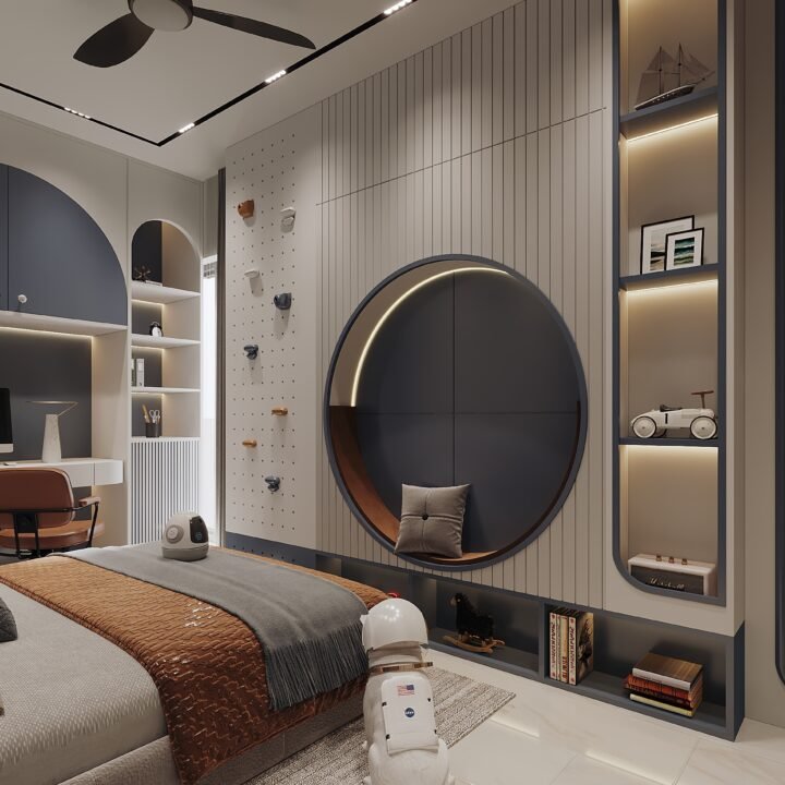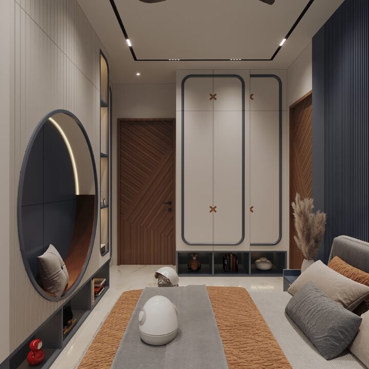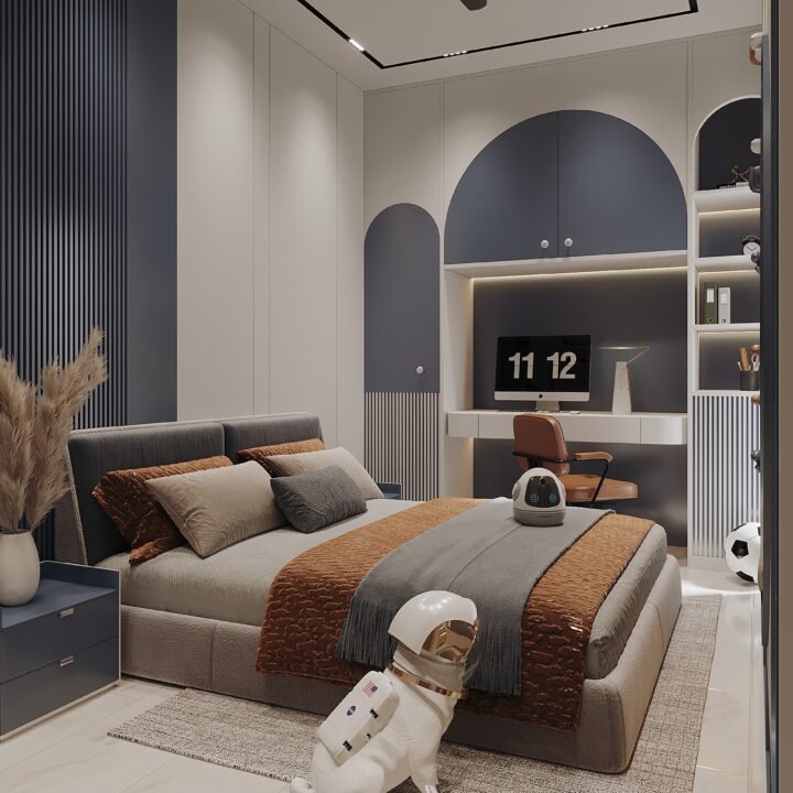 At Izza Interior Design Studio, we design bedrooms as reflections of individuality and lifestyle. This project embodies our philosophy of merging practicality with playful sophistication—where storage solutions are concealed within sleek cabinetry, and bold accents inspire curiosity and creativity. The design introduces a palette that harmonizes warm wood, deep navy, and soft neutrals to establish balance. Every detail—from the integrated study desk to the subtle ceiling design—enhances both comfort and functionality, while decorative elements infuse character and charm. This bedroom becomes more than just a place to sleep—it becomes a space that nurtures imagination, growth, and modern living.