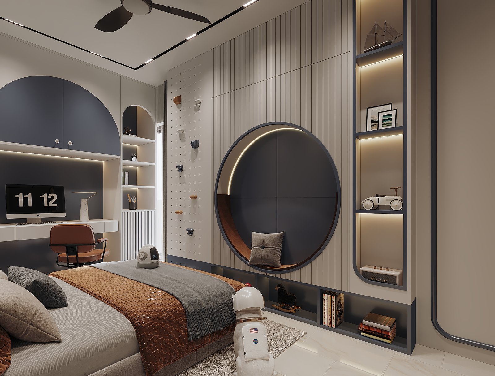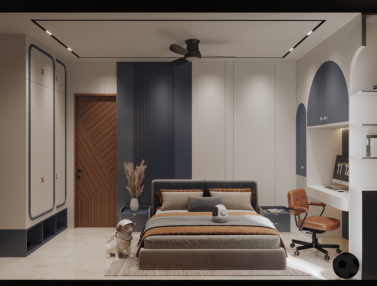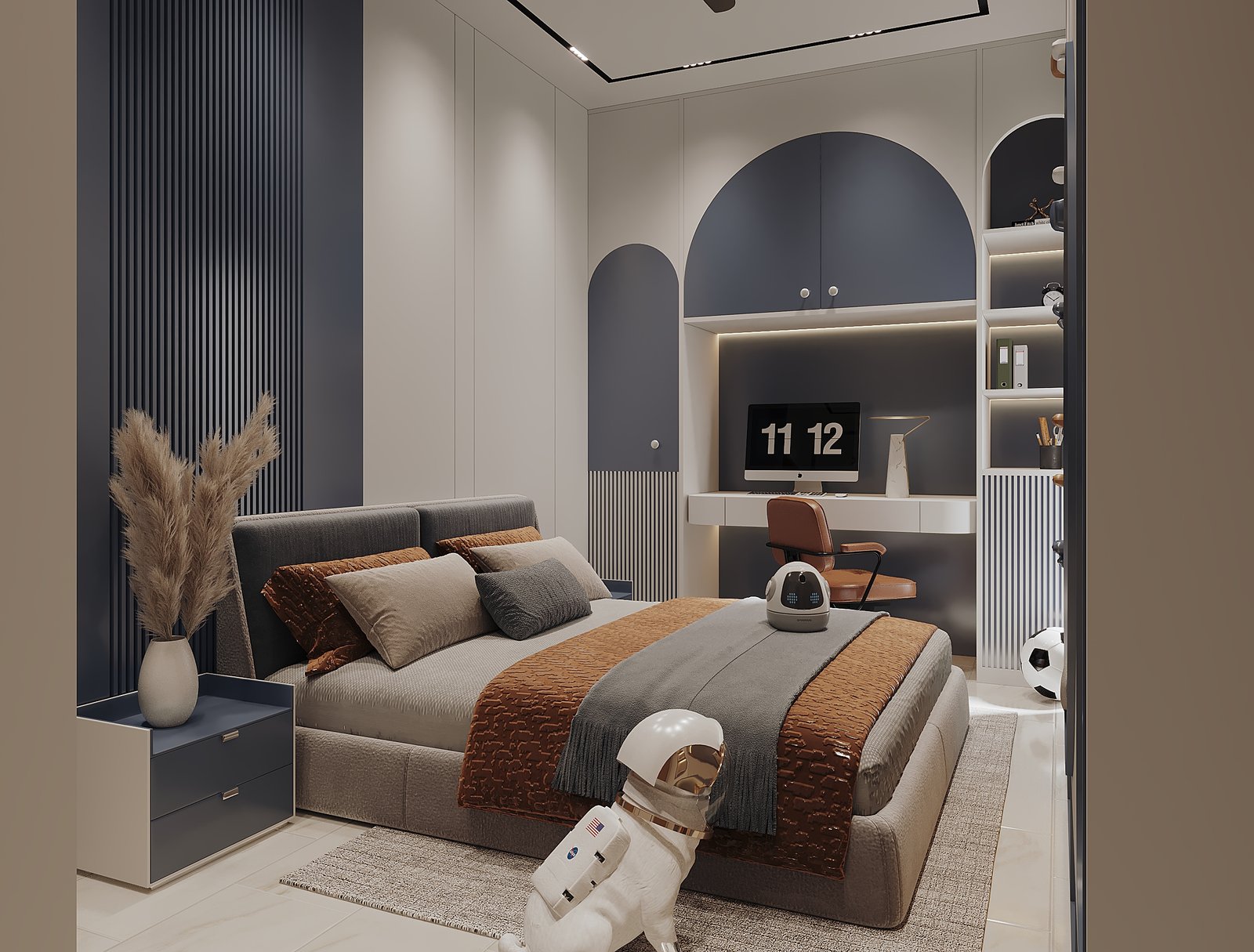 This bedroom design by Izza Interior Design Studio is a contemporary blend of style, comfort, and personality. Defined by its bold navy-blue accents, clean white cabinetry, and warm wood details, the space strikes a balance between playfulness and functionality. A cozy upholstered bed layered with earthy-toned bedding sits at the center, creating a restful core for the room. The workspace corner, integrated seamlessly into the cabinetry, caters to productivity without disrupting the calming aesthetic. Decorative touches like the astronaut-inspired dog sculpture, sports accents, and curated textures bring a youthful charm to the space. Sleek lines, geometric forms, and subtle lighting transform this room into a personalized retreat for both rest and creativity.