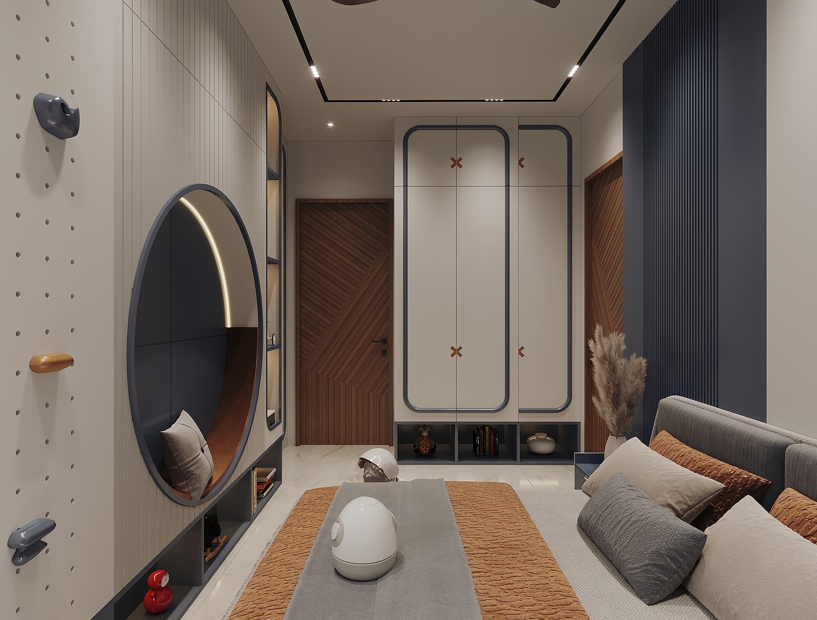 At Izza Interior Design Studio, we design bedrooms as reflections of individuality and lifestyle. This project embodies our philosophy of merging practicality with playful sophistication—where storage solutions are concealed within sleek cabinetry, and bold accents inspire curiosity and creativity. The design introduces a palette that harmonizes warm wood, deep navy, and soft neutrals to establish balance. Every detail—from the integrated study desk to the subtle ceiling design—enhances both comfort and functionality, while decorative elements infuse character and charm. This bedroom becomes more than just a place to sleep—it becomes a space that nurtures imagination, growth, and modern living.